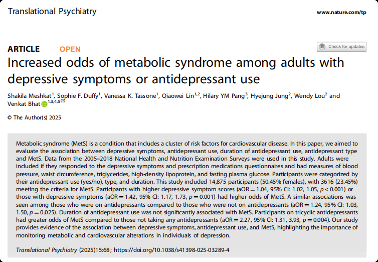 2.Meshkat S, et al. 抑郁症状与代谢综合征的关联. Transl Psychiatry. 2025;15(1):68. doi:10.1038/s41398-025-03289-4
